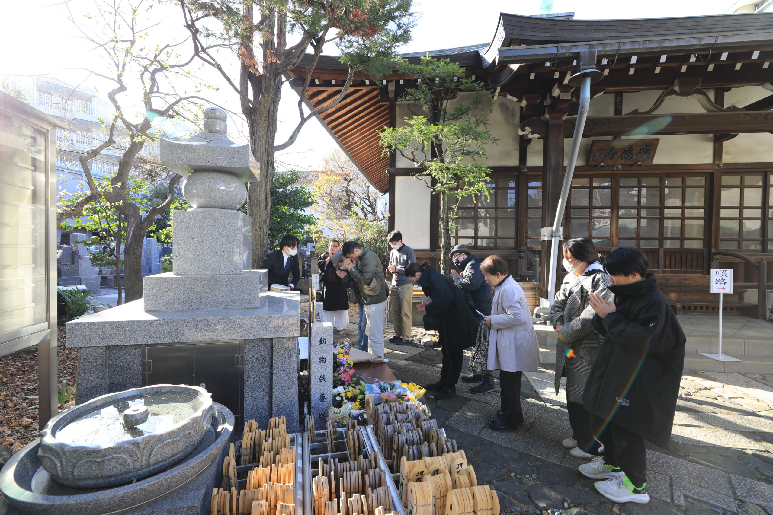 感応寺本堂前の動物供養塔は24時間お参りすることができます。お線香・お花等をお供えすることもできます。